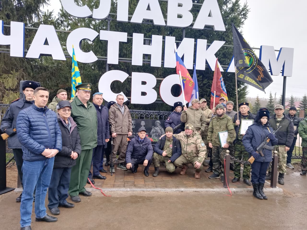 На открытии арт–объекта «ZOV» с речью выступил глава администрации Кушнаренковского района Латыпов М.З. Гостем открытия стал офицер, участник СВО, кавалер двух орденов Мужества и ордена «Спецназ» Ахмат – Исламгулов Динар, позывной «Сармат».